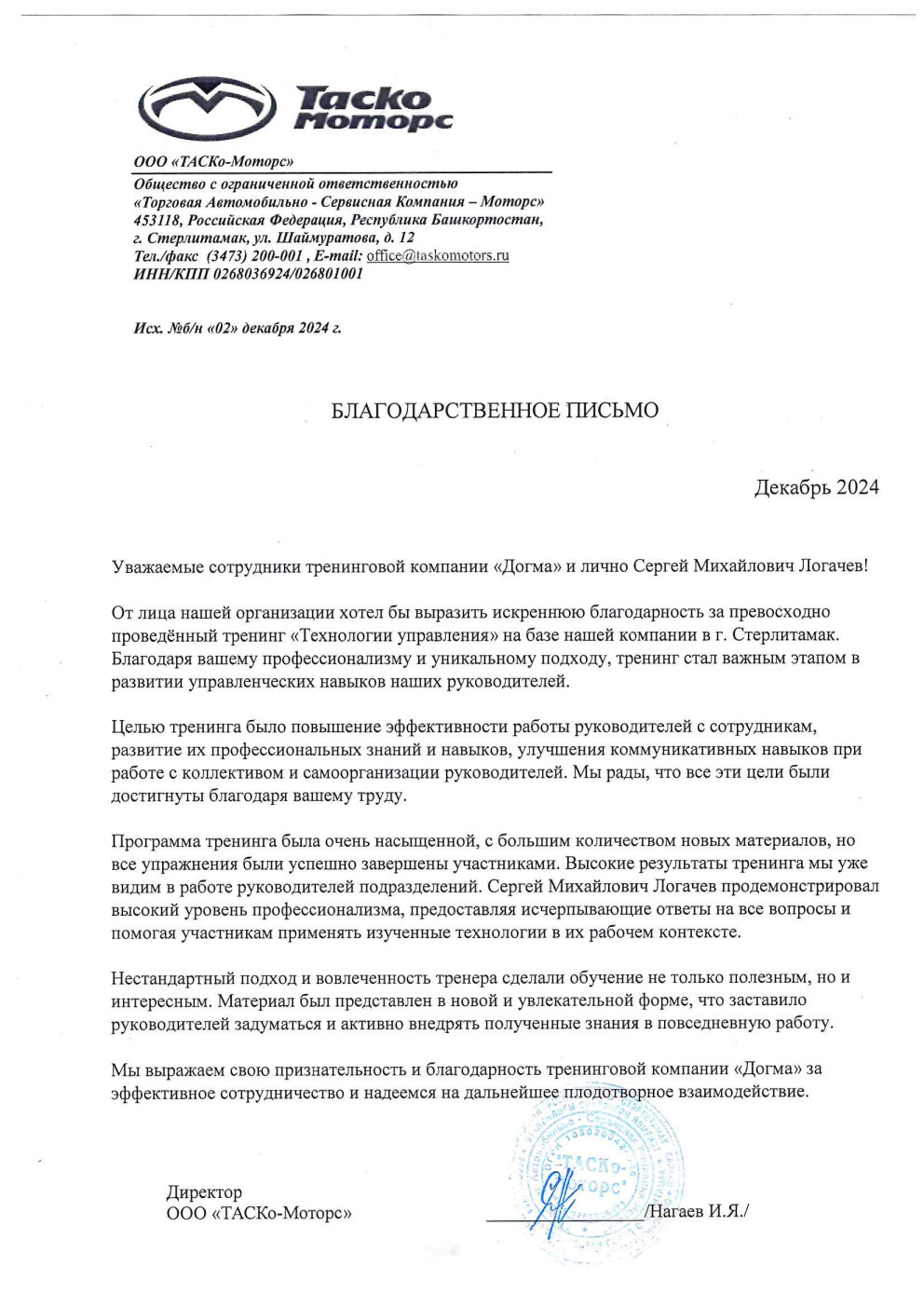 …От лица нашей организации хотел бы выразить искреннюю благодарность за превосходно проведённый тренинг «Технологии управления» на базе нашей компании в г. Стерлитамак.