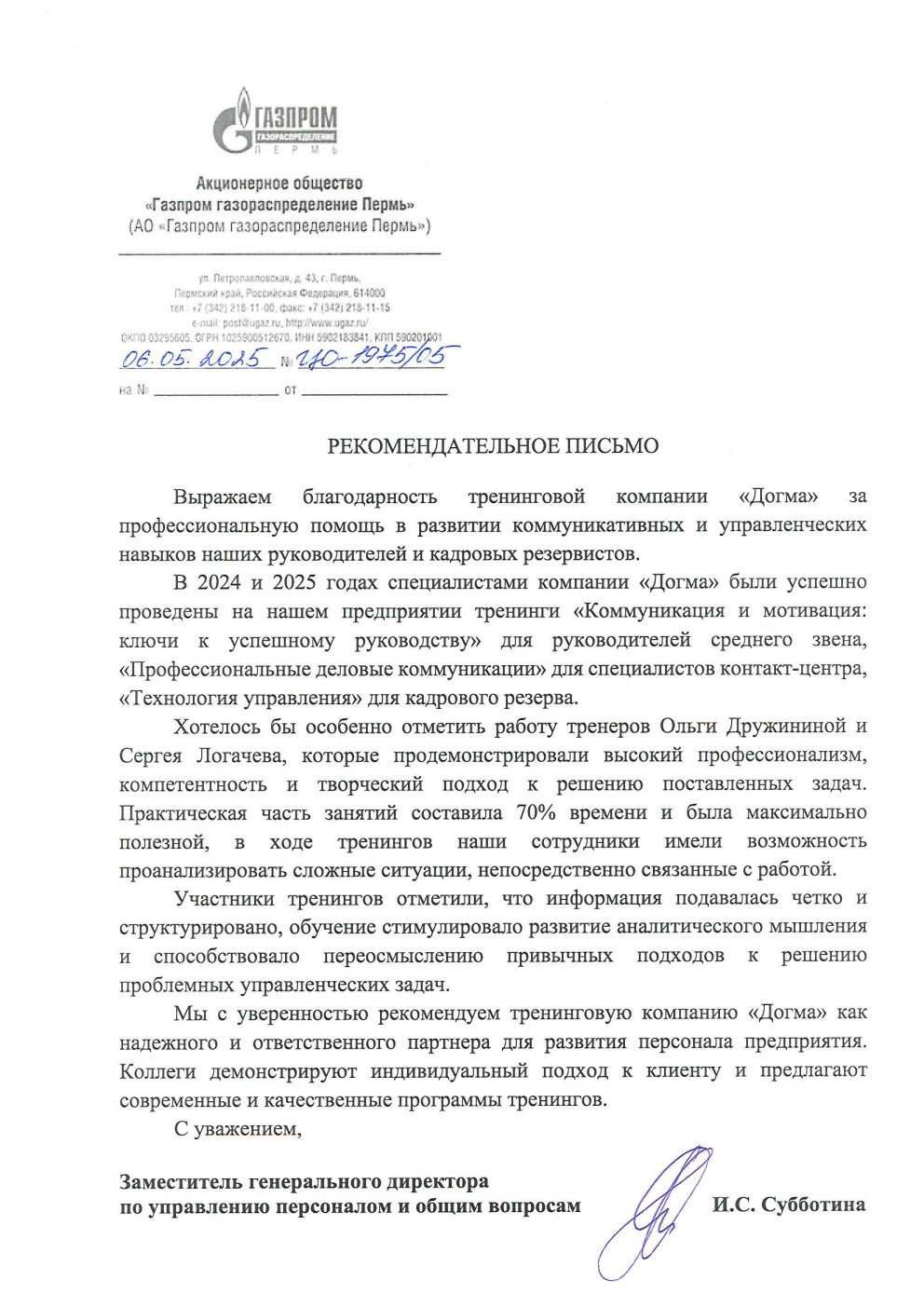 …Мы с уверенностью рекомендуем тренинговую компанию «Догма» как надежного и ответственного партнера для развития персонала предприятия.