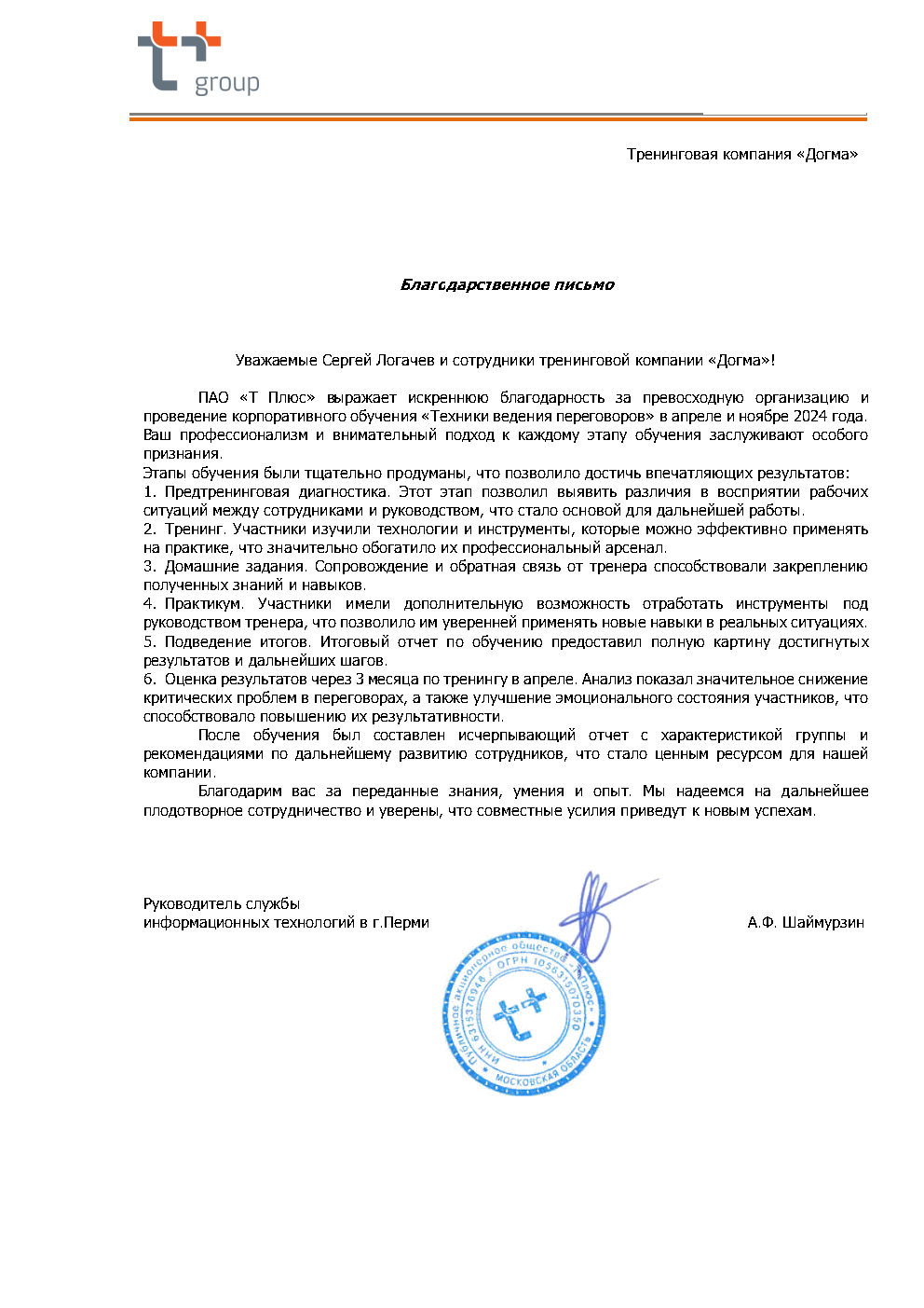 ПАО «Т Плюс» выражает искреннюю благодарность за превосходную организацию и проведение корпоративного обучения «Техники ведения переговоров» в апреле и ноябре 2024 года. Ваш профессионализм и внимательный подход к каждому этапу обучения заслуживают особого признания.