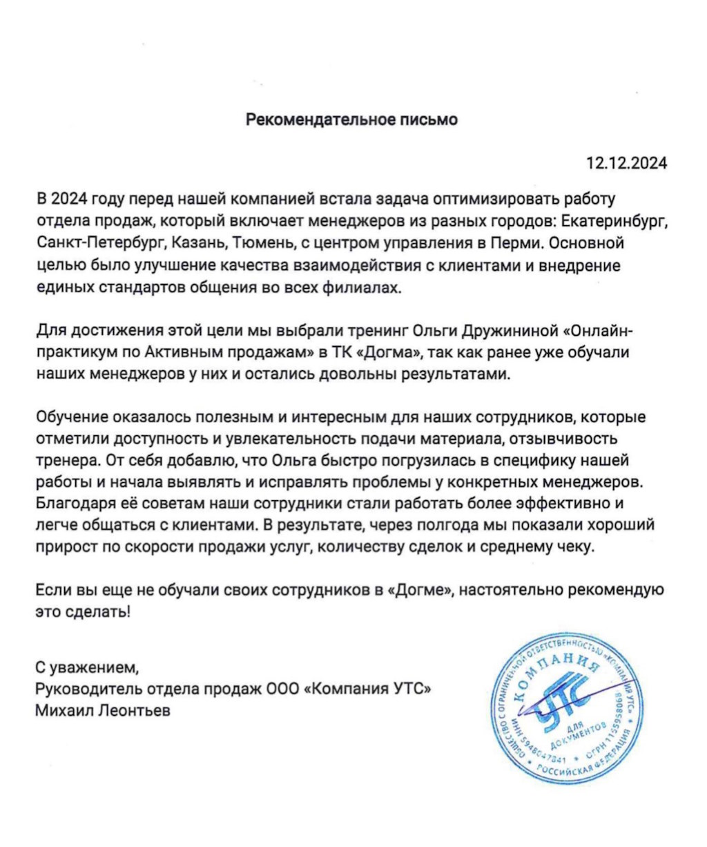 …Мы выбрали тренинг Ольги Дружининой «Онлайн-практикум по Активным продажам» в ТК «Догма», так как ранее уже обучали наших менеджеров у них и остались довольны результатами.