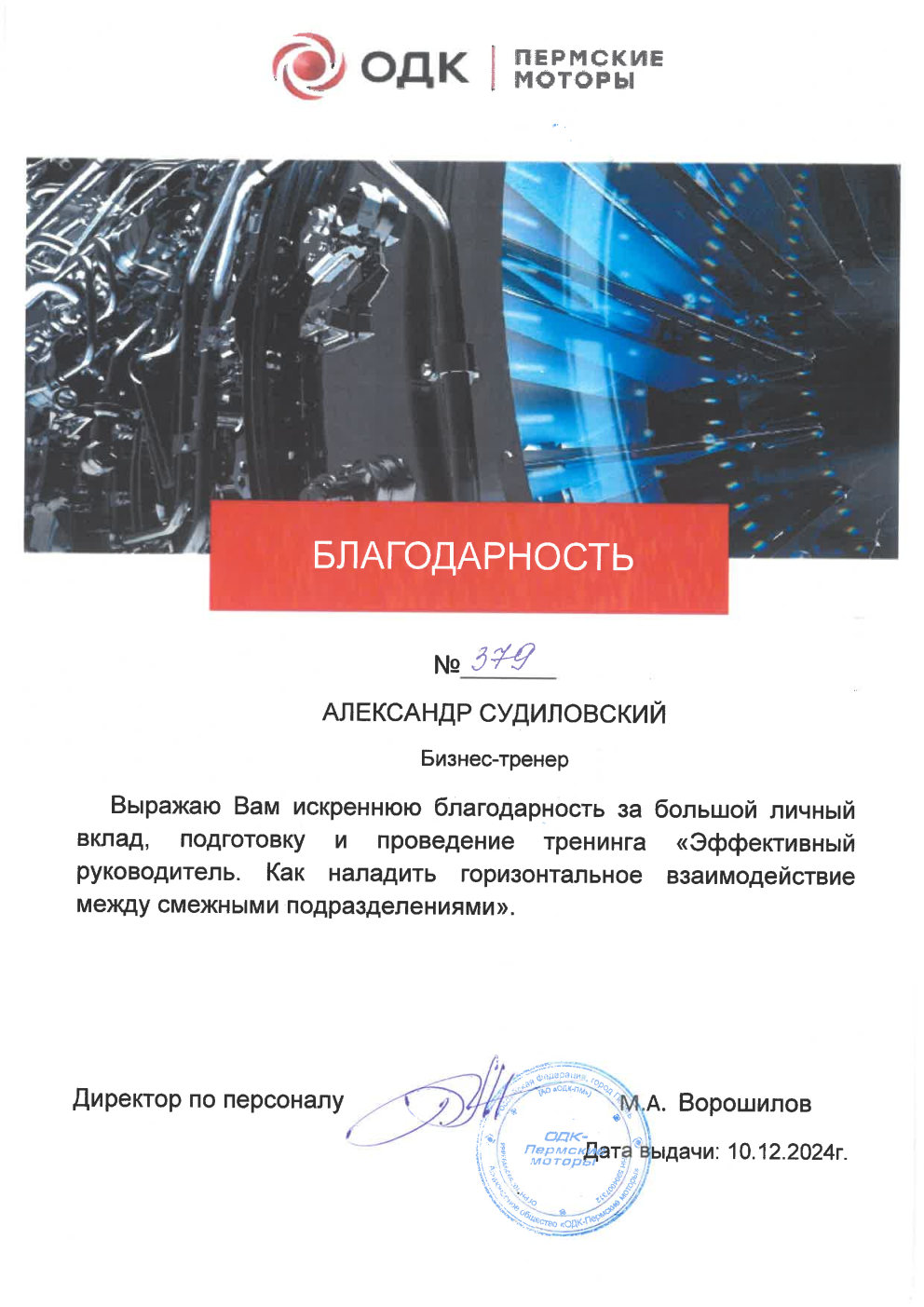 Выражаю Вам искреннюю благодарность за большой личный вклад, подготовку и проведение тренинга «Эффективный руководитель. Как наладить горизонтальное взаимодействие между смежными подразделениями».