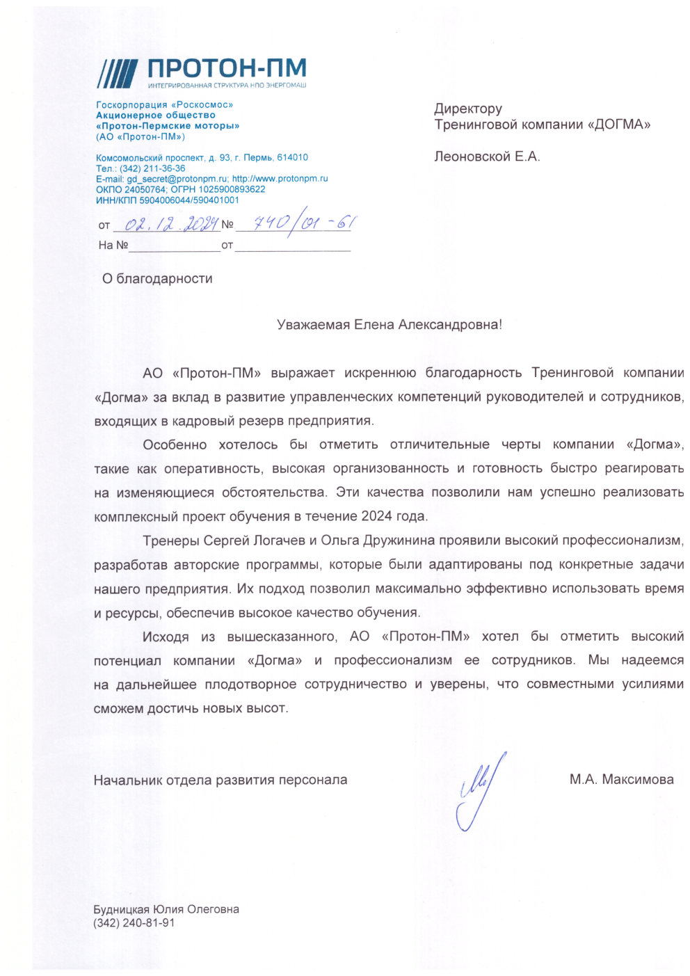 АО «Протон-Пермские моторы» выражает искреннюю благодарность Тренинговой компании «Догма» за вклад в развитие управленческих компетенций руководителей и сотрудников, входящих в кадровый резерв предприятия.