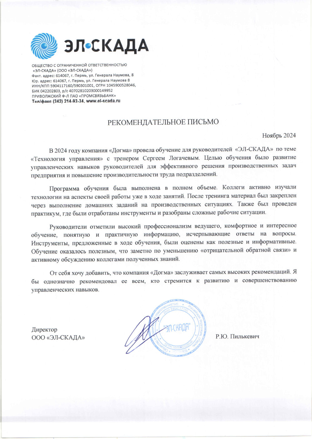 В 2024 году компания «Догма» провела обучение для руководителей «ЭЛ-CKAДA» по теме «Технология управления» с тренером Сергеем Логачевым.
