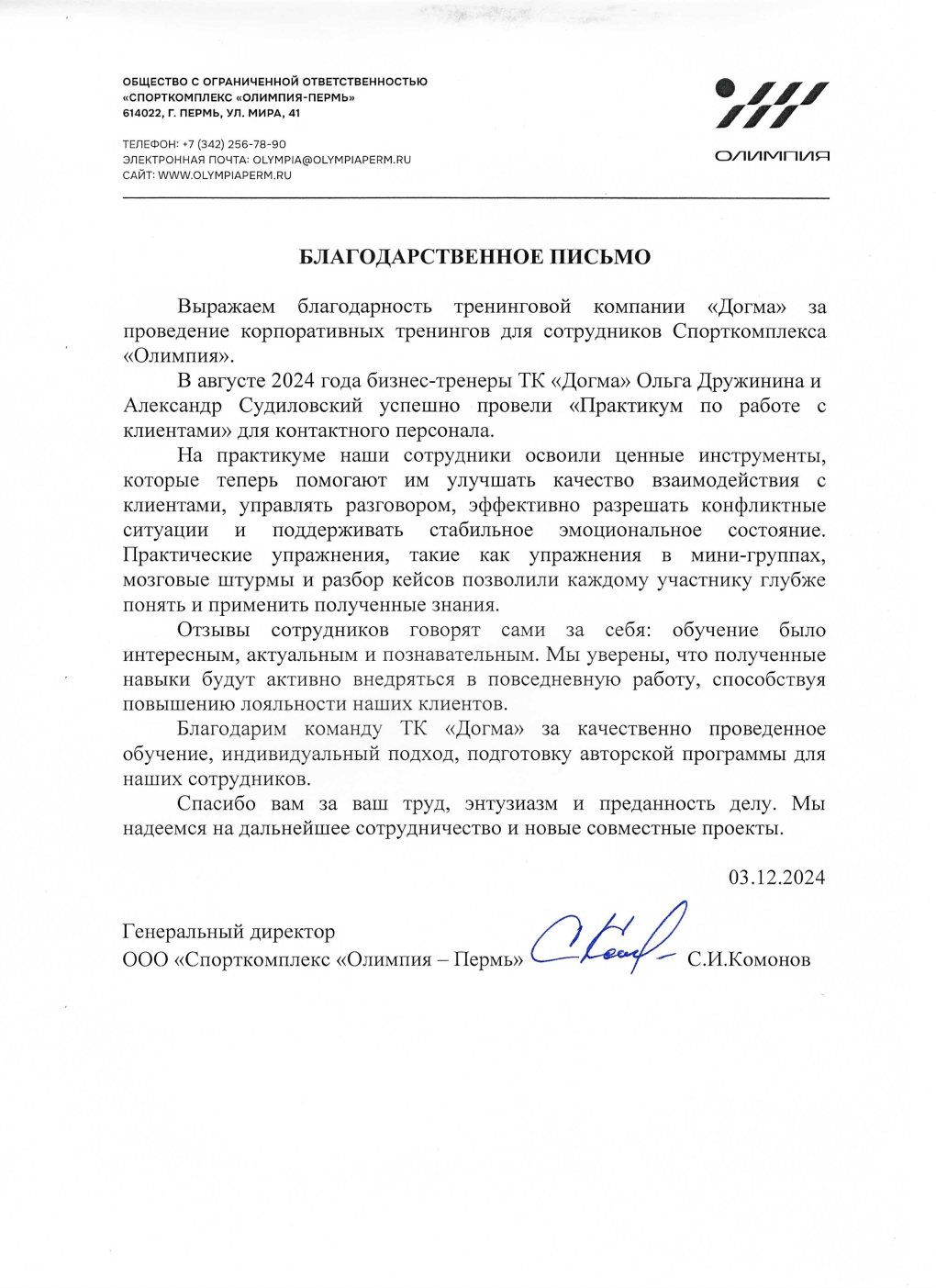 Выражаем благодарность тренинговой компании «Догма» за проведение корпоративных тренингов для сотрудников Спорткомплекса «Олимпия».